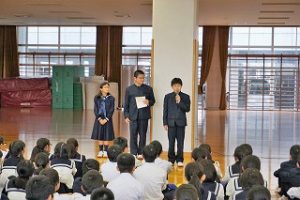 その後、陸上競技部(北総地区大会・三支部予選会)、剣道部(第2ブロック大会)、柔道部(第2ブロック大会)の表彰伝達を行い、最後に生徒がそれぞれの1年間の抱負について全校生徒の前で発表を行いました。