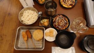 17時以降は大阪新世界、通天閣の真下、味の大丸・初代エビス(同じ会社が運営)に夕食へと向かいました。夕飯はお好み焼きや串カツなどの大阪グルメと鍋料理を堪能しました。