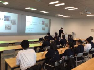 社員食堂で昼食後、近藤さんにアントレプレナーシップをテーマに講義をしていただきました。ご自身の経験に基づいたお話に生徒たちも目を輝かせながら熱心に聴いていました。アントレプレナーシップにおける物事の見方や思考の枠組み、心のあり方を学ばせていたただきました。
