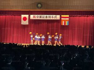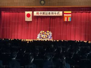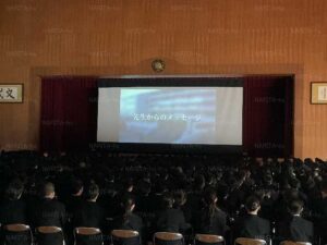 その次に予餞会。主な次第は在校生からの卒業記念品目録贈呈、ダンスドリル部の演目、音楽部の演奏、放送部作成のスクールメモリーズ上映(学年職員のメッセージあり)です。