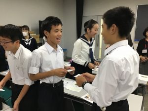 代表生徒による自己紹介のデモンストレーション。大勢の前で話すのは緊張しますね!