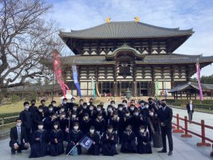 平等院鳳凰堂を見学。10円玉をバックにクラス写真です。