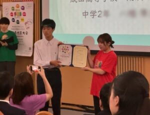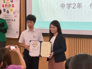 2名とも10月18日(土)に千葉市生涯学習センターにて行われた表彰式に出席いたしました。表彰式の際には全受賞者とも作品紹介のプレゼンテーションと動画の紹介が行われ、それぞれ出席者から質問や感想が述べられ応答しておりました。