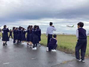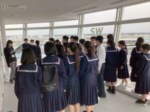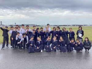 10月24日(金)午後、中学生の希望者27名が成田空港見学会に参加しました。普段は入れない区域をガイドつきで見せていただき、大変貴重な機会になりました。当日はあいにくの天気でしたが、「雨ニモマケズ」写真や画像を撮り続けている強者多数。空港や飛行機が好き、親が空港で働いているなど参加の理由はさまざまでしたが、成田空港が身近な、そして欠かせない場所であることを改めて知る時間になったと思います。