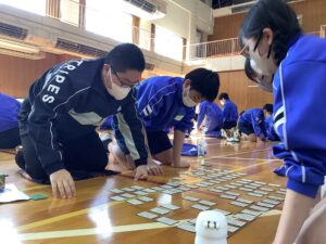 また、団体戦ではクラスでペアをつくって、クラス対抗で戦います。どの生徒も百首の和歌を覚えてきた成果を存分に発揮していました。上の句が読まれるまでの静寂からとても真剣に百人一首に向き合っている雰囲気が感じられました!