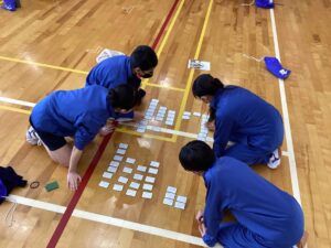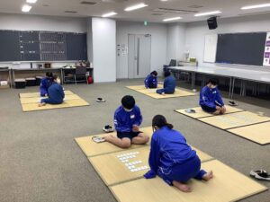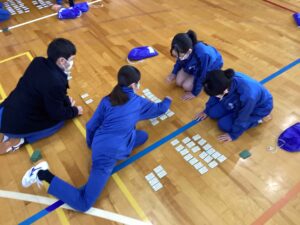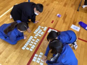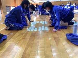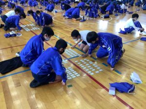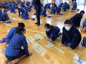 また、団体戦ではクラスでペアをつくって、クラス対抗で戦います。どの生徒も百首の和歌を覚えてきた成果を存分に発揮していました。上の句が読まれるまでの静寂からとても真剣に百人一首に向き合っている雰囲気が感じられました!