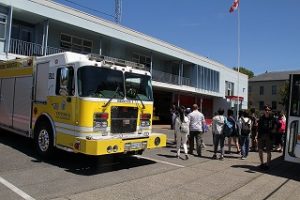 今日の午後はまず消防署見学です。事前に「もし出動命令が出たら,途中でも打ち切ります」と言われて消防隊員による説明が始まりました。レスキュー車や消防車の運転席に実際に座らせてもらえ,特に男子諸君はご満悦でした。