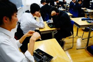 まずは高1の授業風景。英語の先生の熱弁に生徒も熱心に耳を傾けています。実際に自分の模試の採点をすることで現状と志望校の距離を明確に感じ取ることができたようです。