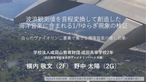 「波浪観測値を音程変換して創造した海洋音楽に含まれる 1/f ゆらぎ現象の検証-自らのヴァイオリン二重奏で奏でる海洋音楽の癒し効果- 」横内敬文・野中太陽(高校2年)