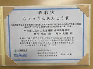11⽉4⽇(⼟)に北海道大学函館キャンパスで開催されました「海の宝アカデミックコンテスト2023 全国⼤会 -海と⽇本PROJECT-」にて本校生徒2名が入賞しましたのでお知らせします。