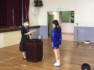 まず、表彰がありました。成田山競書大会、日輪賞の受賞者6名の代表者が、教頭先生から賞状と賞品が授与されました。